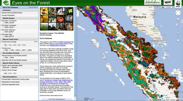 Spurred on with a Google Earth Outreach Developer Grant, WWF hired developer David Tryse to build eyesontheforest.or.id, a catalog of maps rich with information about the change in Sumatra’s forest cover, tiger, elephant, rhino and orangutan ranges, floral diversity and carbon stocks over time.